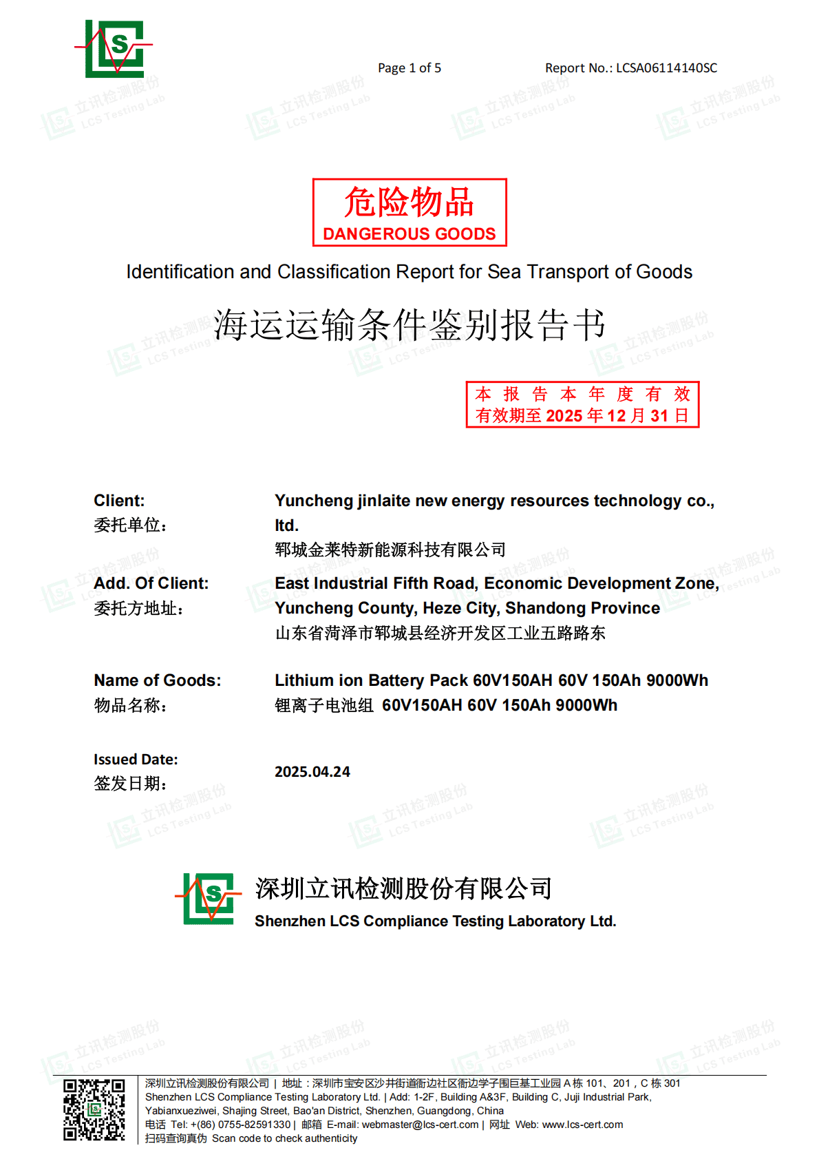 Identifies lithium batteries as Class 9 Dangerous Goods and confirms compliance with IMDG (International Maritime Dangerous Goods) sea-transport regulations. Required for ocean freight bookings.
