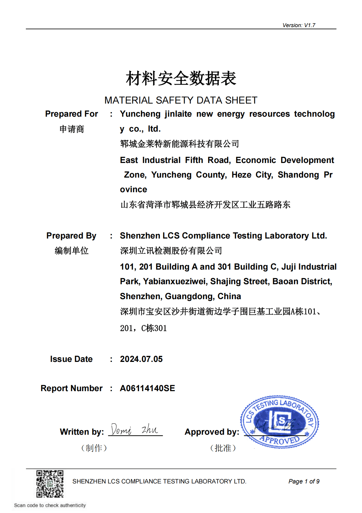 Chemical safety documentation for lithium batteries, covering hazard identification, safe storage, firefighting measures and emergency handling. Required by customs and shipping companies.